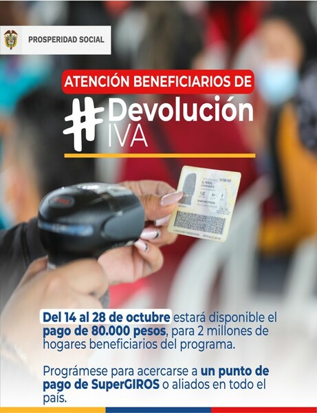 ATENCION: Beneficiarios del programa de Devolución del IVA inician los pagos del Ciclo 5, los recursos estarán disponibles en el operador de pago Súper Giros y sus aliados en todo el país. Recuerde presentar su cedula original para el correspondiente cobro
